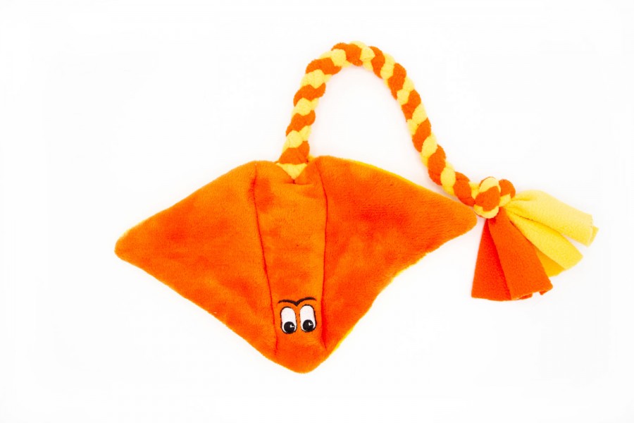 Das Plüschspieli besteht aus weichem Material mit aufgestickten Augen und einem Quitscher im Bauch. Die weich unterlegte Handschlaufe mit passender Borte ist an einem Bungee-Seil, dass ein Zerrspiel für deinen Hund und dich angenehmer macht.