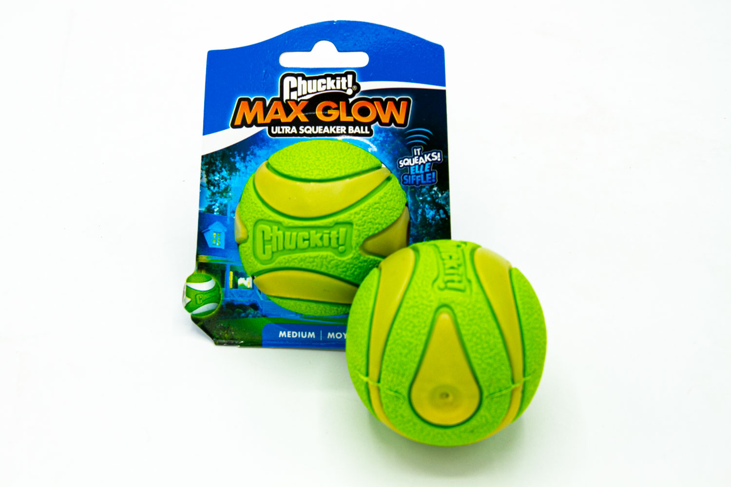Der Chuckit Max Glow Ultra Squeaker kombiniert strapazierfähiges Gummi – für eine hohe Sprungkraft – und einen hohen Quietschfaktor mit Glow in the dark für optimalen Spielspaß.