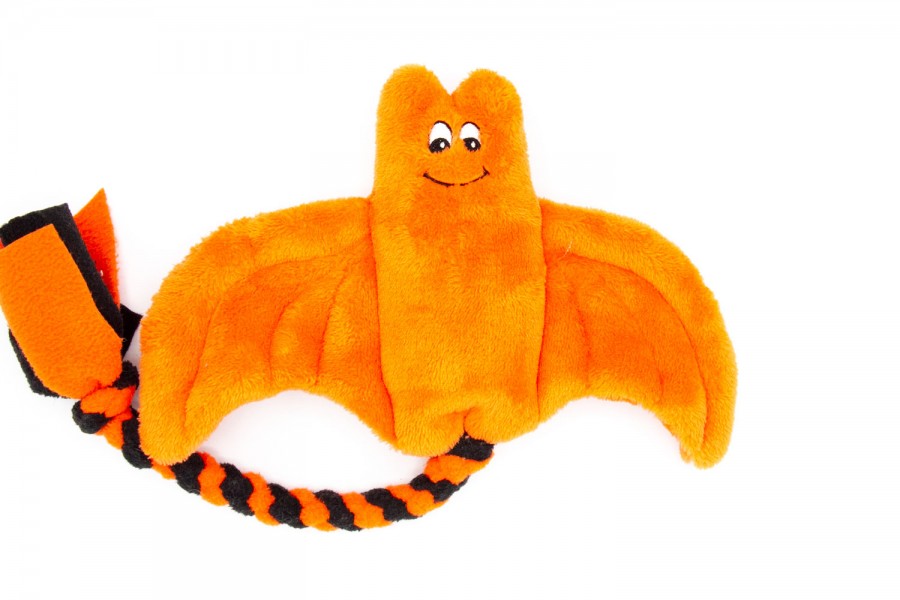 Die Fledermaus besteht aus weichem bissfestem Plüschmaterial mit aufgestickten Augen – sie hat also keine aufgenähten Kleinteile, die von deinem Hund verschluckt werden können. Die Fledermaus hat einen kleinen Quitscher im Bauch und am Ende einen aus Fleecestreifen geflochtenen Schwanz.