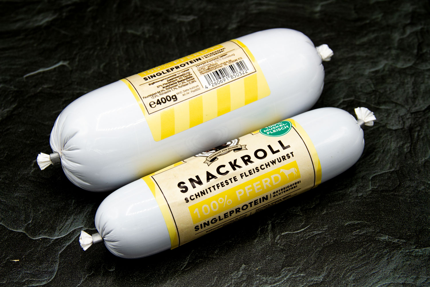 Schnittfeste Pferd-Fleischwurst für Hunde aus 100 % sortenreinem Pferde-Muskelfleisch (Singleprotein) und wenig Tapioka.