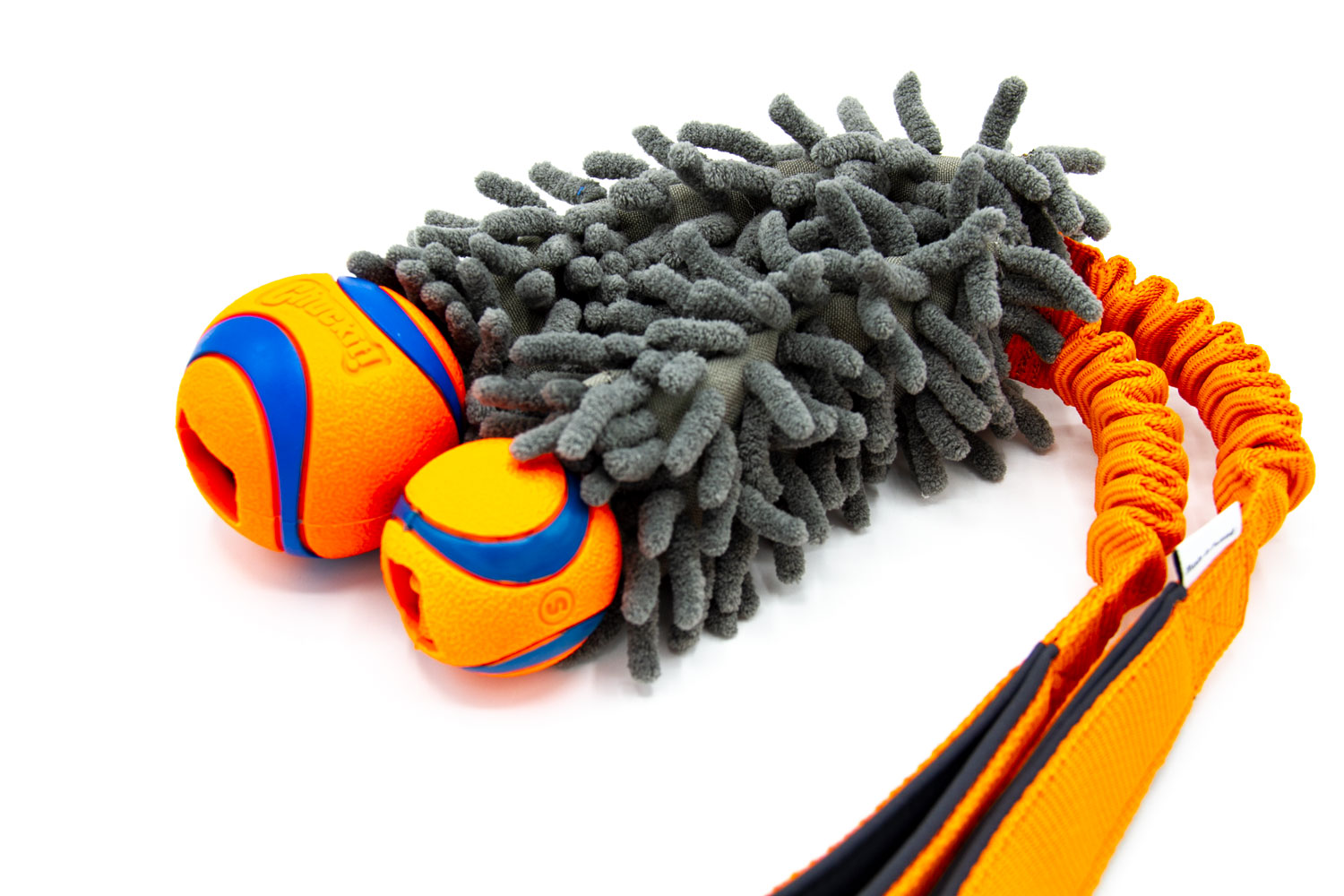 Der Mop Bungee Chuckit besteht aus dem original ChuckIt Ball, einem Mop als Beißfläche und einem dehnbaren Bungee-Griff.