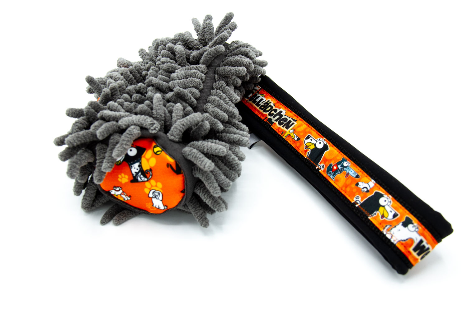 Der Mop ist aus Mikrofaser hergestellt. Die Handschlaufe besteht aus einem Gurtband und ist mit Softshell unterlegt, so dass das Spieli angenehm in deiner Hand liegt und nicht einschneidet. Durch die Materialien kannst du das Hundespielzeug bedenkenlos bei 30 Grad in die Waschmaschine stecken, sollte es doch mal im Matsch landen oder vollgesabbert sein.