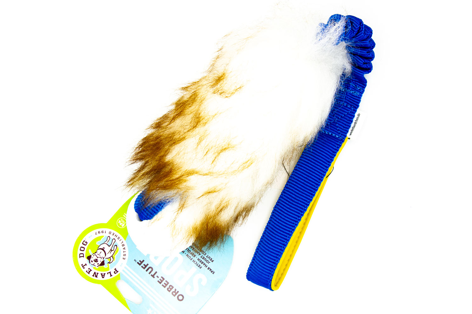 Sheepskin Tug mit Golfball besteht aus dem weicheren Golfball von Planet Dog, einem Teil aus Schaffell und einer weichen Handschlaufe an einem Bungee.